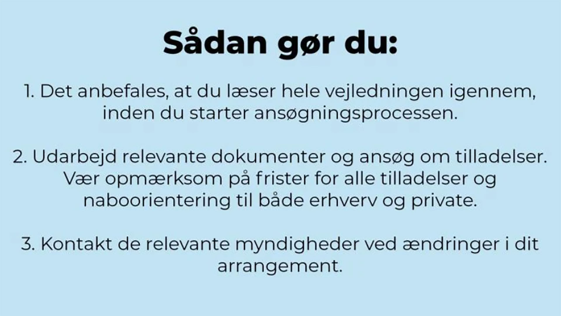 Naboer skal orienteres 14 dage før arrangementets afholdelse. både beboere, virksomheder og butikker om dit arrangement; karakter, varighed, eventuelle lydprøver og om at der vil blive spillet høj musik eller bliver støj i øvrigt. Det foregår typisk ved at hænge sedler op på hoveddøre i lokalområdet.
